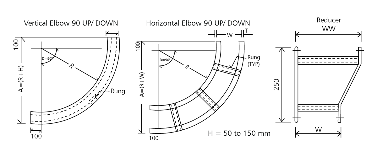 Finish : Red Oxide/ Enamel Paint/ Epoxy Paint/ Powder Coating / Hot Dip Galvanised / Anodised or as per customer specification. H = 50 to 200 mm W/WW = 100 to 1200 mm D = 30/45/60/90/120 Deg R = 150 to 1200 mm Accessories can be made as per customer specification too.